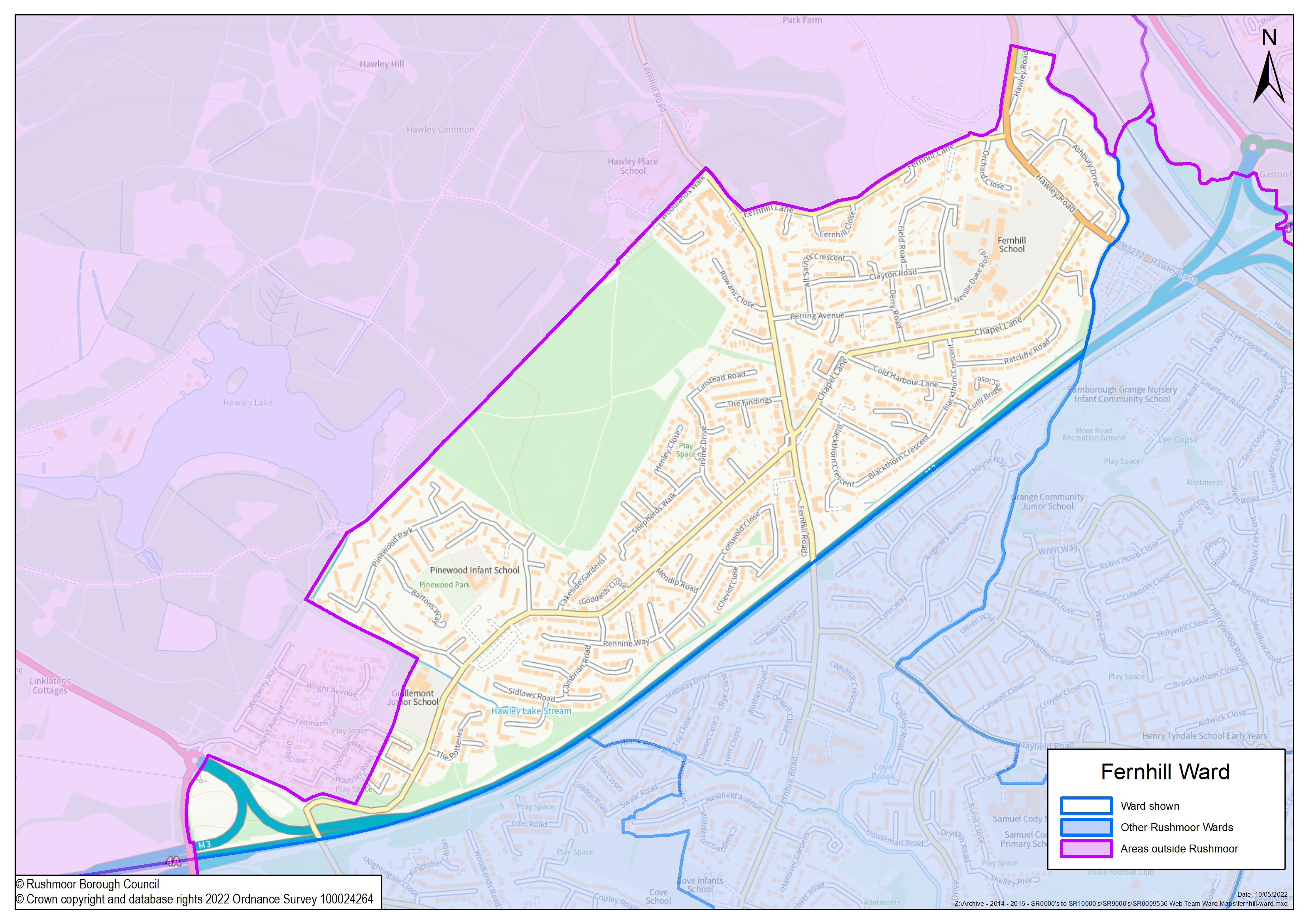 Fernhill covers the majority of the area to the north of the M3 motorway and is bounded by Hawley Woods.