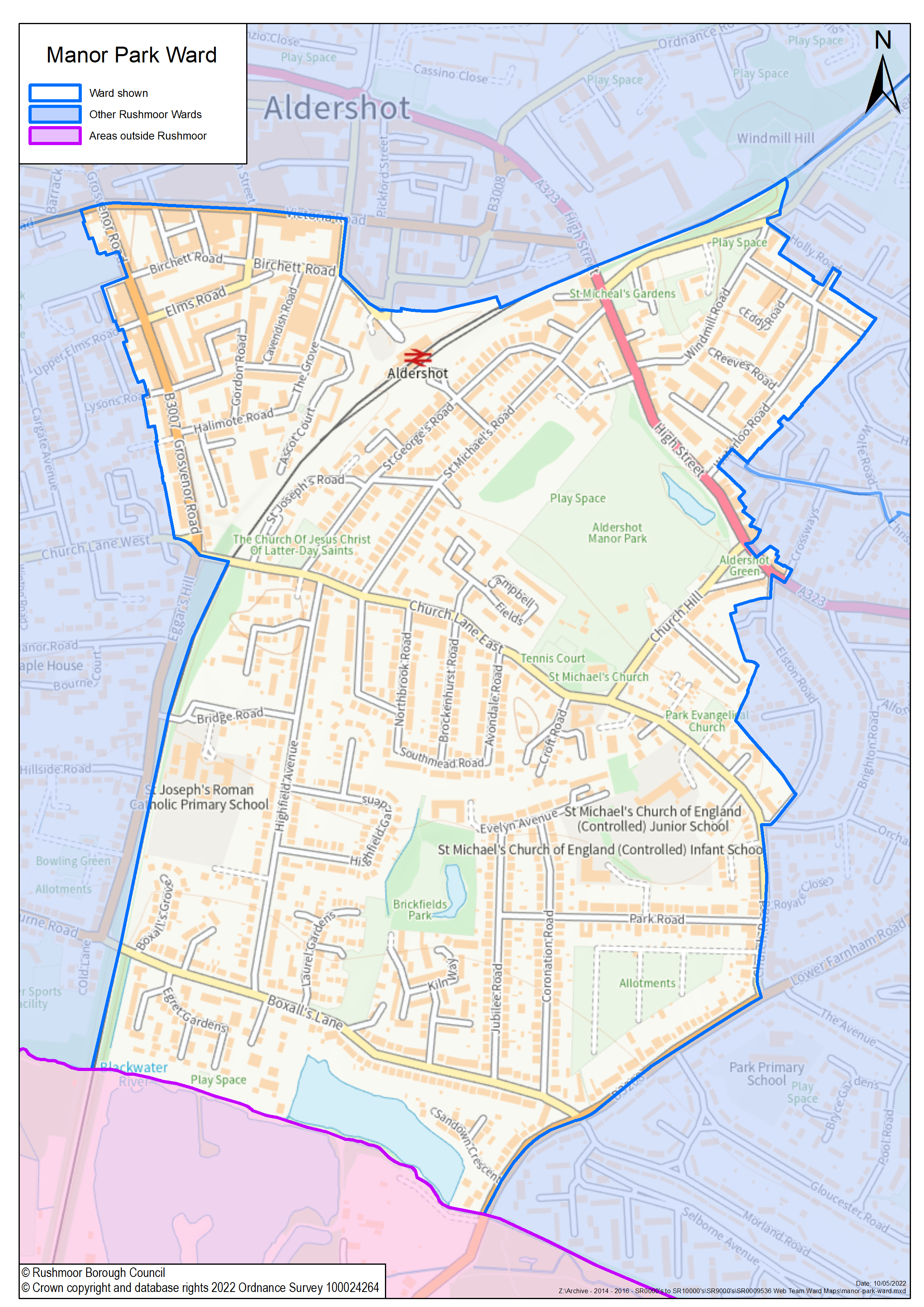 Manor Park covers the area in Aldershot surrounding the park, from the railway line in the west continuing up Grosvenor Road, the High Street in the North and to Lower Farnham Road in the south east.