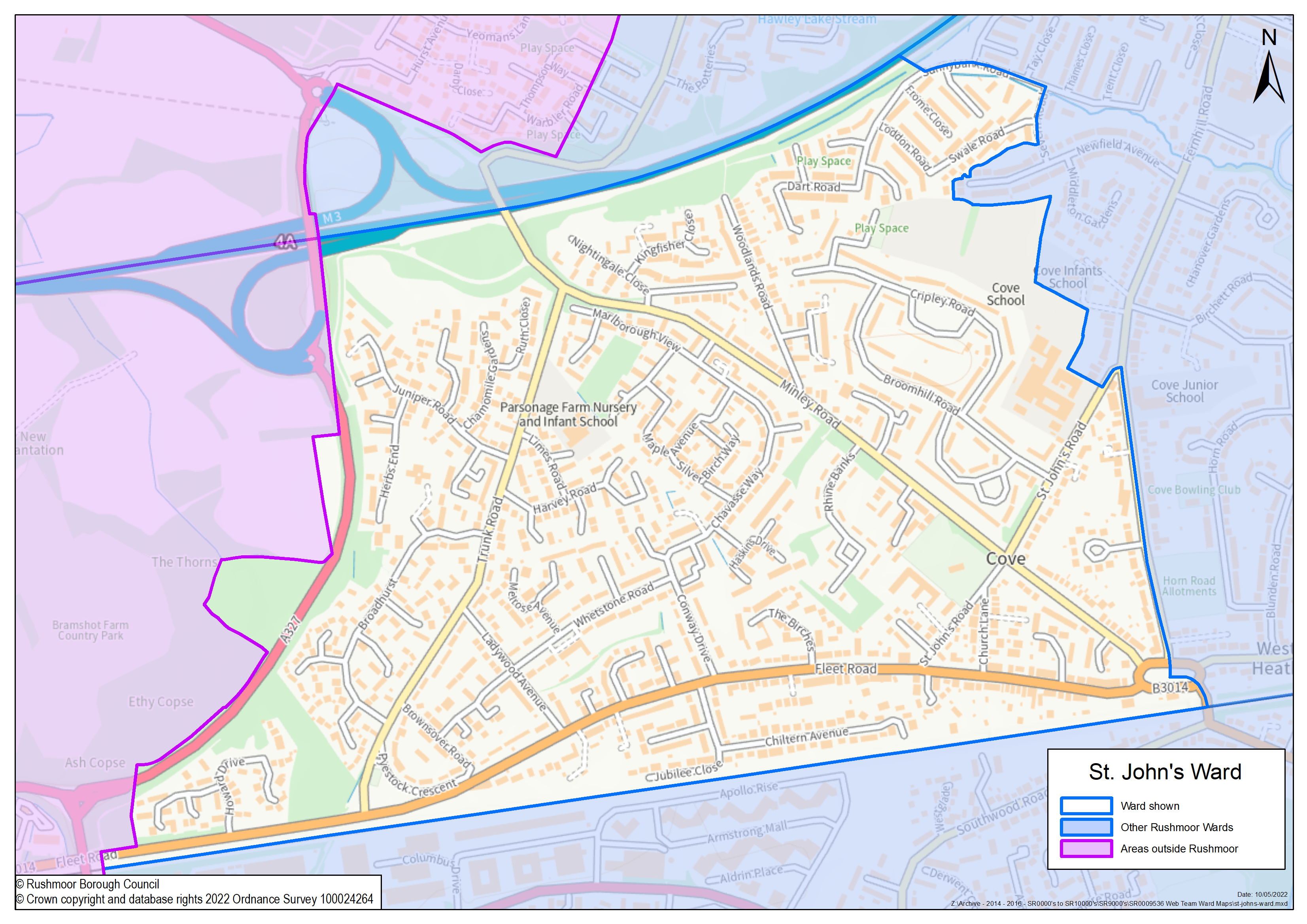 St John's covers the west of Farnborough, between the railway and the M3. Minley Road runs through the centre of the ward.